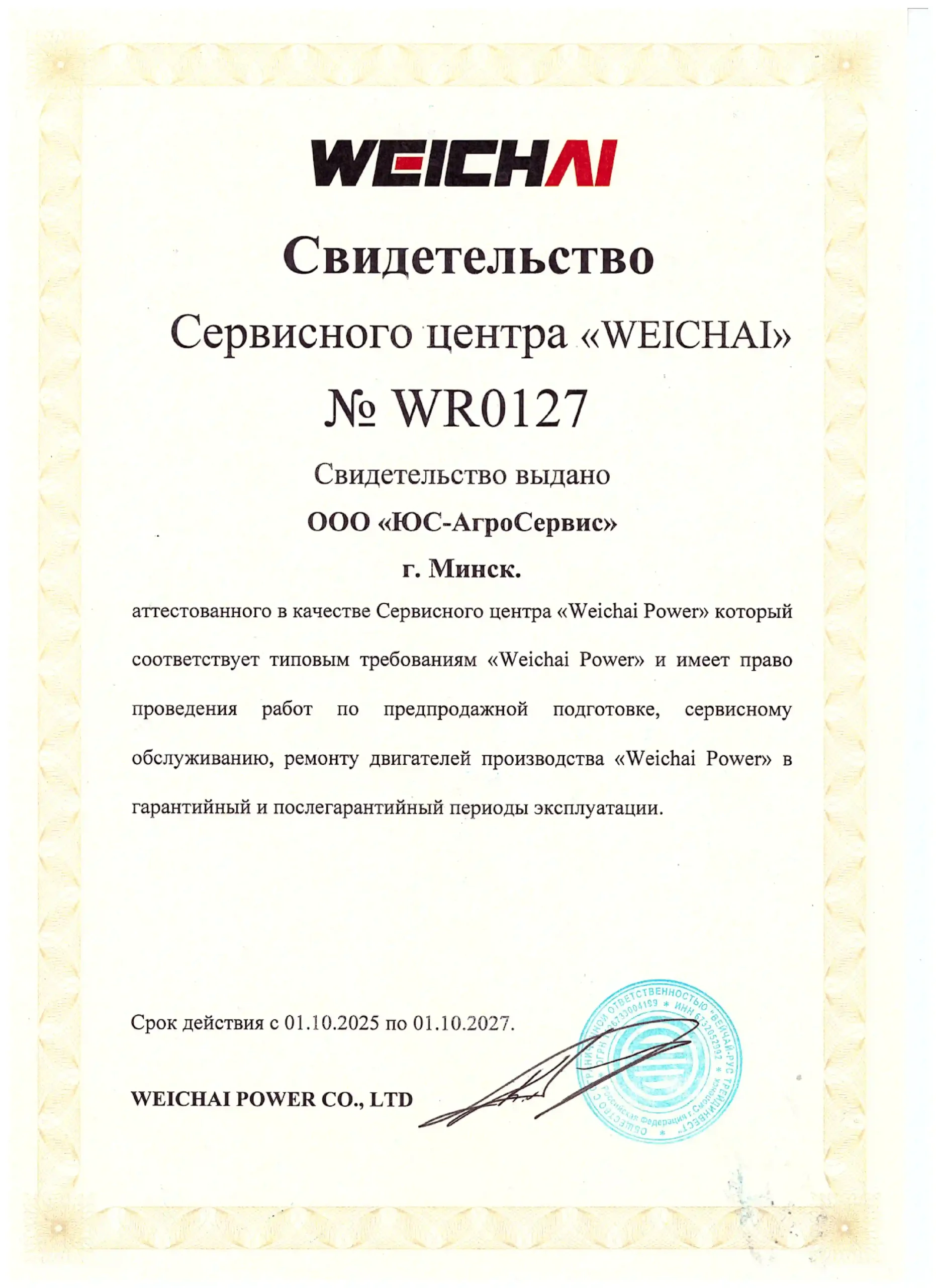 Компания имеет официальный статус сервисного партнёра Weichai и работает только с оригинальными запчастями. Мы даём гарантию на все виды работ и обеспечиваем высокое качество обслуживания. Благодаря многолетнему опыту и собственным технологиям ремонта, нам доверяют сельхозпредприятия, фермерские хозяйства и частные владельцы техники по всей стране.